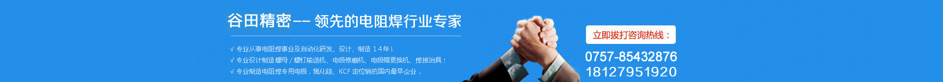 始于2004,从前身-谷川机电公司到如今的谷田精机.我们谷田、谷田人矢志不渝,一直专注于电阻焊(点焊)事业,专业、专心为汽车焊装用户提供高品质、极具性价比的设备、电极产品。我们的产品,从貌似简单的电极、KCF耗材,到电阻焊机、自动螺母输送机、自动螺栓输送机、电极修磨机、电极更换机、焊接品质监控管理仪器..........